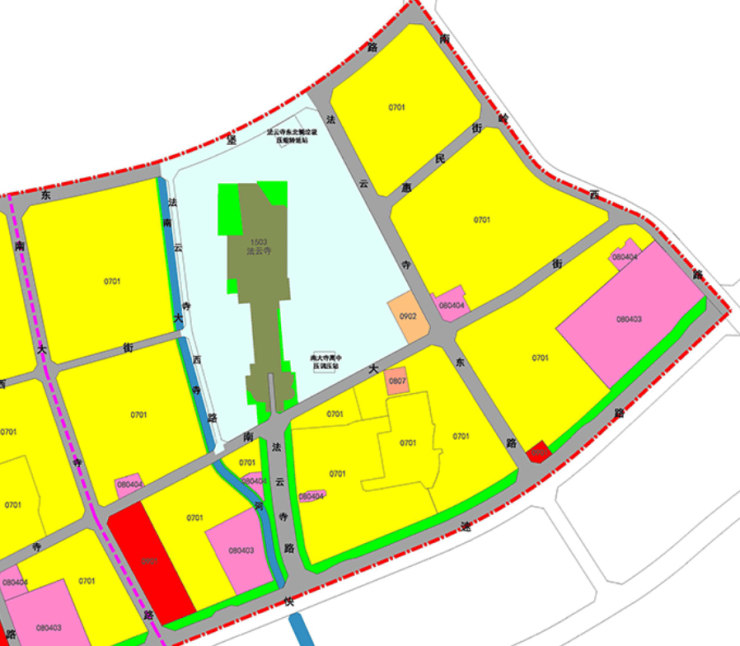 位于单元中部,东至南大寺路,南至西部快速路,西至慕义寨路-兴凯湖路,北至法云寺南大街-山东堡路;街区面积107.09公顷。XB0502街区以生活居住为主导。