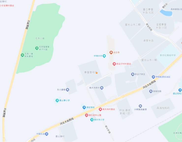 根据地图显示,该街区游览功能主要由法云寺及周边公园绿地承担,生活居住区主要由星光山水一期二期三期、秦皇壹号院、承荣半岛三大新盘及下庄安置房、新店子安置房、南大寺新村安置房组成。