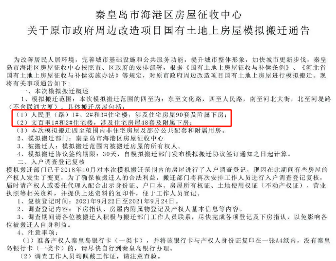 据悉,2021年9月20日,海港区房屋征收中心发布《原市政府周边改造项目国有土地上房屋模拟搬迁通告》。