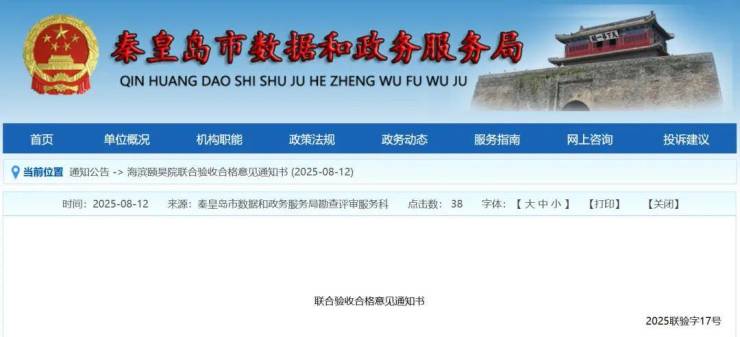 截止到2025年8月12日,市自然资源和规划局(竣工规划核实意见书核发)、市住建局(建设工程城建档案验收)、市数政局(防空地下室竣工验收)、北戴河区应急管理局(抗震设防要求专项竣工验收)、北戴河区住建局(建设工程消防验收)、北戴河区自然资源和规划局(建设用地检查核验)出具了验收合格的意见。市国家安全局(涉及国家安全事项的建设项目验收)、市气象局(特殊工程(场所)雷电防护装置竣工验收)、北戴河区教体局(配建教育设施竣工验收)出具了“不涉及”的受理意见。