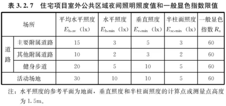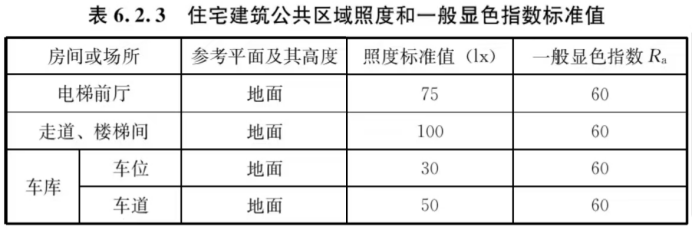 6.2.3 住宅建筑公共区域的照度和一般显色指数不应低于表6.2.3规定的标准值。