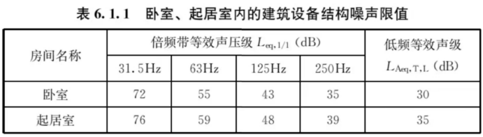 6.1.1 住宅建筑内电梯、水泵、变压器等共用设施设备及空调室外机或新风机组传播至卧室、起居室内的建筑设备结构噪声,不应大于表6.1.1规定的限值。
