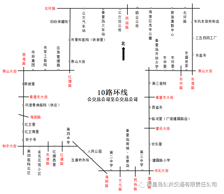 由公交总公司始发行驶北环路、红旗路、燕山大街、西港路、和平大街、海阳路、河北大街、建国路、燕山大街、东港路、北环路至公交总公司。