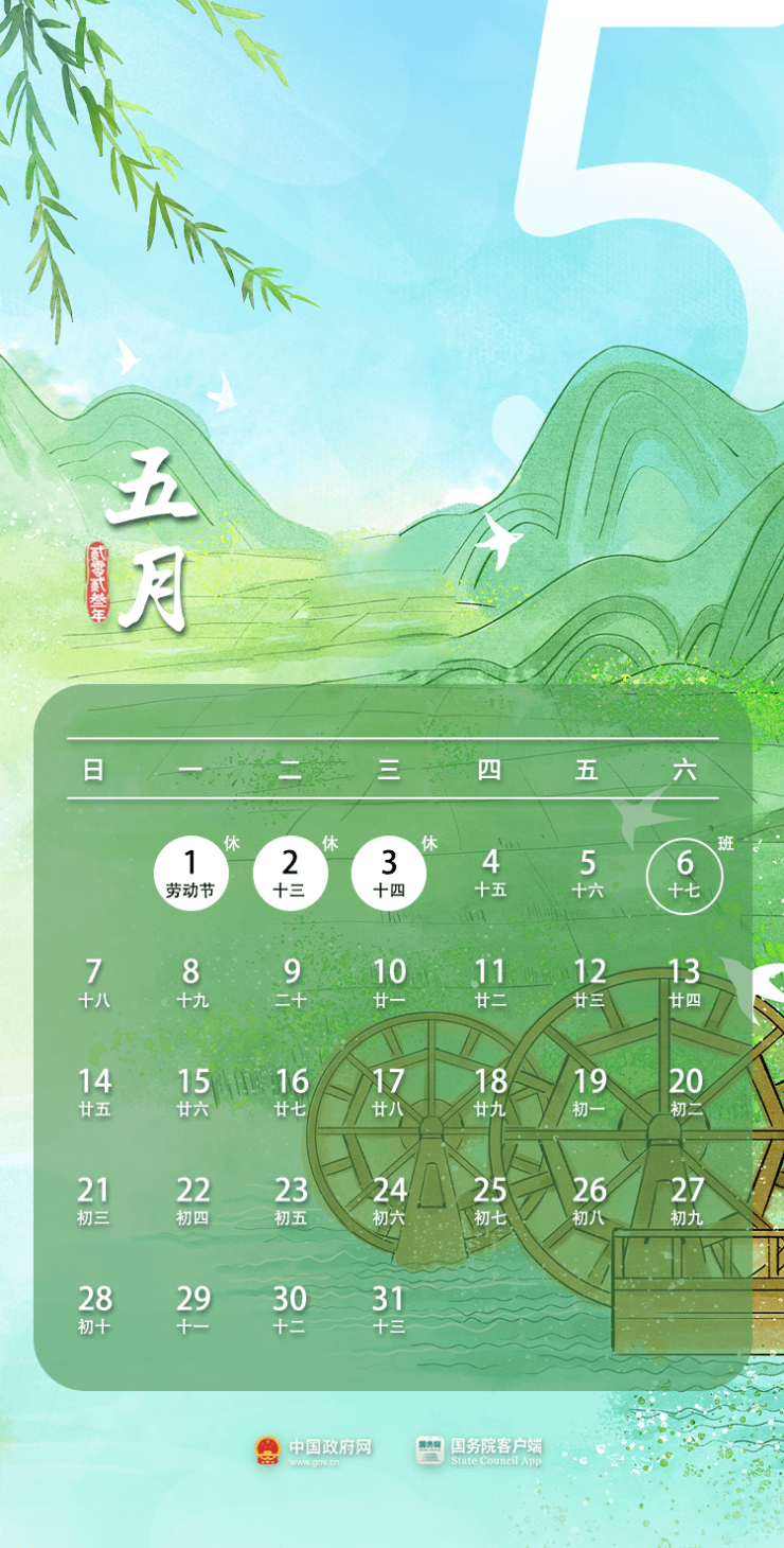 劳动节:4月29日至5月3日放假调休,共5天。4月23日(星期日)、5月6日(星期六)上班。