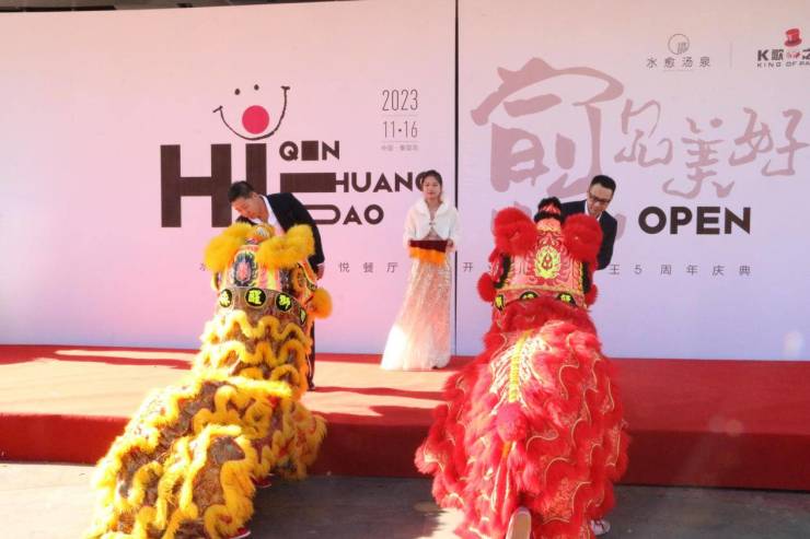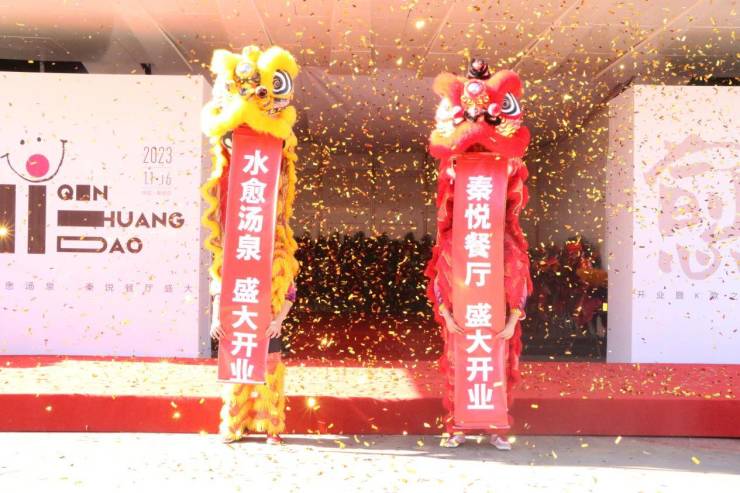 吕总、张总再次登台,为祥狮点睛。点睛起灵,祥狮纳福,寓意鸿运当头,福星高照。唤醒的雄狮灵活地舞动,主持人宣布“秦悦餐厅&水愈汤泉正式开门迎客”。