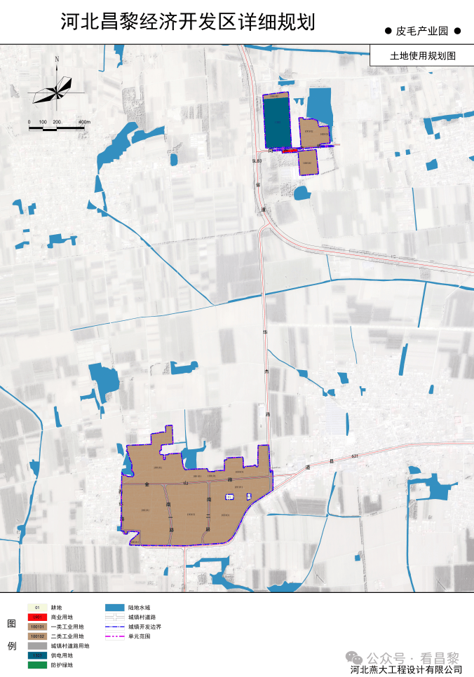 皮毛产业园区位于昌黎县西南部,紧邻荒佃庄镇政府驻地。园区分为南北两个片区,北片区位于高速连接线东侧、西腾远村东侧,荒佃庄村北部和上各庄村东部,片区面积14.00公顷;南片区位于荒佃庄镇区西侧、蛇刘公路北侧,前双坨村北部和后双坨村东部,片区面积60.83公顷。本次规划范围为74.83公顷,其中位于城镇开发边界内的面积为74.50公顷。园区打造“北部皮草加工片区+南部精密制造片区”两个功能片区。北部皮草加工片区建设以皮草加工产业为主导,兼顾发展新能源、精密制造业的特色产业片区;南部精密制造片区建设以铸造、精加工、装配为一体的精密加工片区。