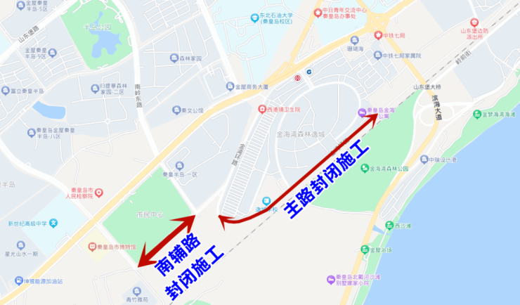 按照金梦海湾变电站电力配套管沟工程建设需要,经交管部门批准,拟定于2023年7月10日早6点至2023年8月31日早6点,对金湾环路(森林逸城东南门-公交场站段)道路主路及翠岛大街(河清路-海晏路段)南辅路进行封闭断交施工。