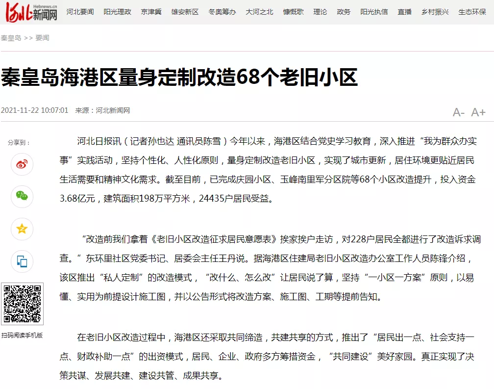 截至目前,海港区已完成庆园小区、玉峰南里军分区院等68个小区改造提升,投入资金3.68亿元,建筑面积198万平方米,24435户居民受益。