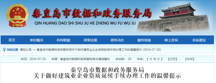 按照《建筑业企业资质管理规定》(住房城乡建设部第22号令)要求,全市具有相关资质的建筑业企业应于资质证书有效期届满3个月前,向秦皇岛市数据和政务服务局申请资质证书有效期延续,企业净资产和主要人员应满足《建筑业企业资质标准》(建筑〔2014〕159号)规定,并经核实合格后,更换有效期5年的资质证书,有效期自批准延续之日起计算。企业在资质证书有效期届满前3个月内申请资质延续的,秦皇岛市数据和政务服务局受理申请,资质证书有效期届满之日至批准延续之日内,企业不得承接相应资质范围内的工程。资质证书有效期届满,企业仍未提出延续申请的,其资质证书自动失效。