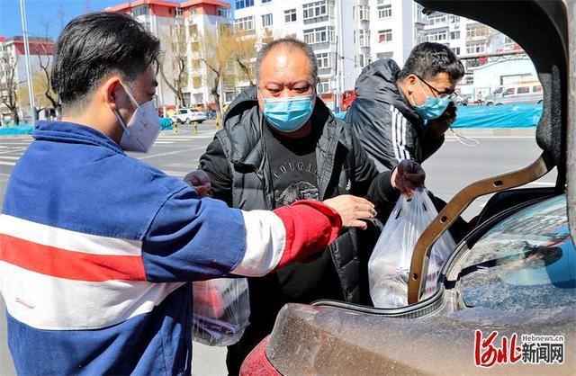 河北省秦皇岛市海港区海滨路街道滨海城社区居民王金龙(左)为海滨路街道滨海城社区工作人员送上盒饭。