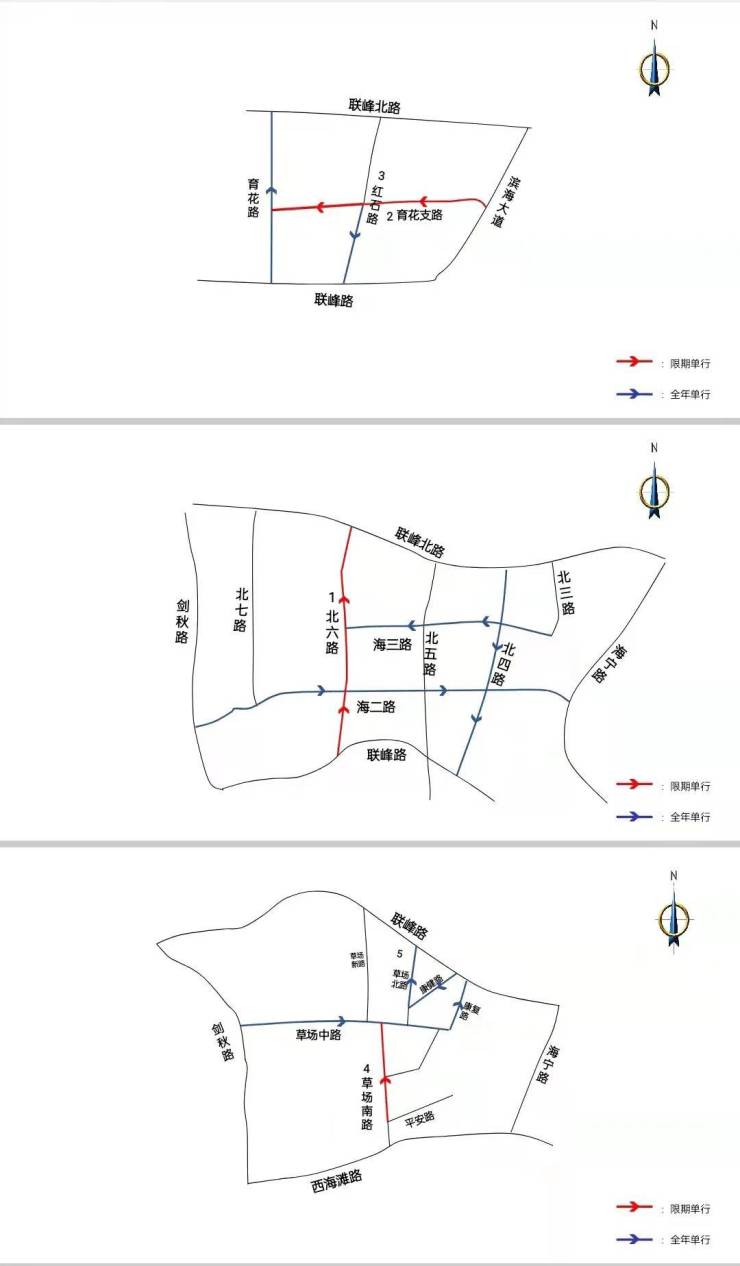 4、草厂南路(西海滩路至平安路)全年允许双向行驶;草厂南路(平安路至草场中路)4月29日0时至8月31日24时只允许由南向北单向行驶,禁止由北向南行驶。