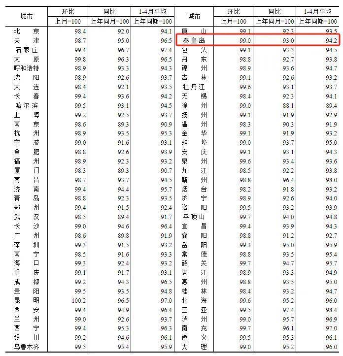 数据显示,4月份秦皇岛新建商品住宅价格环比下跌0.7%,同比下跌4.2%;二手住宅价格环比下跌1.0%,同比下跌7.0%。