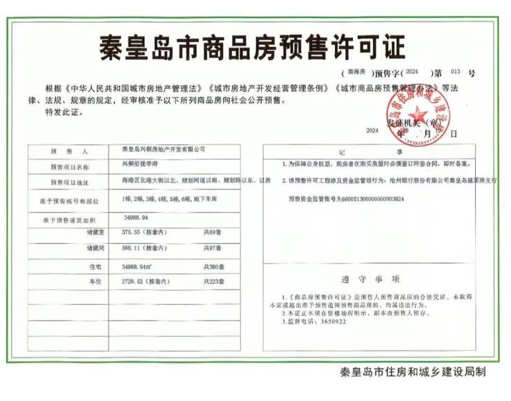 10月12日,兴桐·佰俊学府项目商品房预售许可证颁发。