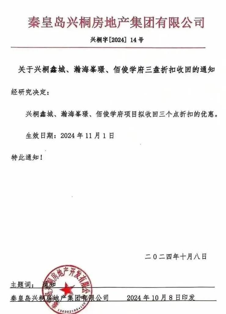兴桐鑫城、兴桐·瀚海峯璟、兴桐·佰俊学府三盘折扣将于2024年11月1日收回,拟收回三个点折扣的优惠。