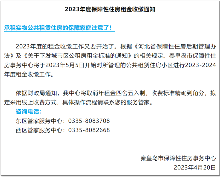 秦皇岛市保障性住房事务中心发布2023年度保障性住房租金收缴通知↓↓↓