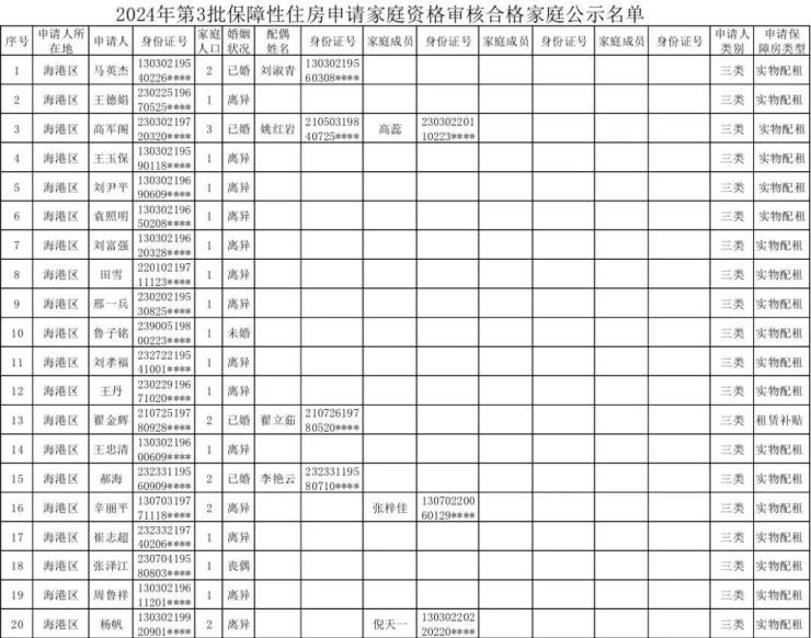 秦皇岛2024年度第3批公租房申请家庭资格审核结果