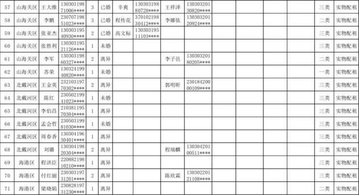 根据秦皇岛市人民政府《秦皇岛市城市区公共租赁住房申请条件》(秦政办字【2020】6号)的有关规定,我中心对海港区申请的54户、山海关区申请的11户、北戴河区6户;共计71户公共租赁住房申请家庭进行了资格复核。现将复核合格人员名单予以公示(名单见附件),敬请社会各界监督。
