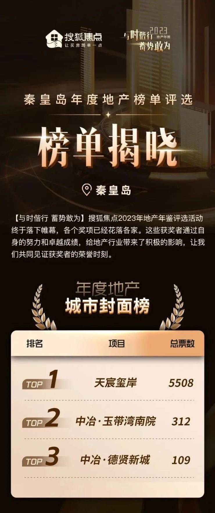 在刚刚结束的“搜狐焦点秦皇岛年度地产榜”评选活动中,“年度地产之城市封面榜”榜单揭晓,天宸玺岸以5508的高票荣登榜首。