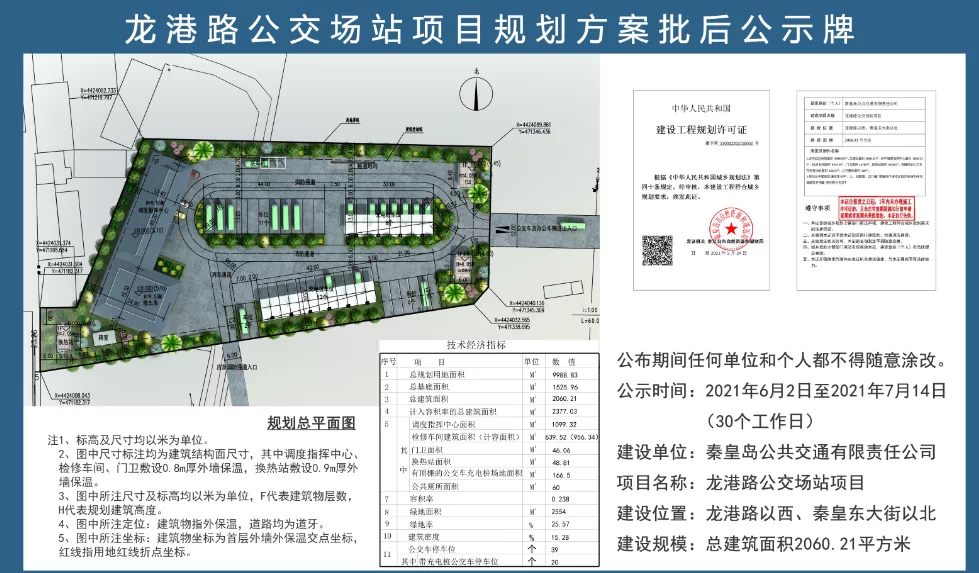 近日,市资源规划局发布有关于龙港路公交场站项目规划方案批后公示牌,该公交场站位于龙港路以西、秦皇东大街以北的位置,建设规模约为2060㎡,该项目总用地面积为9988.83㎡,公交车停车位为39个。