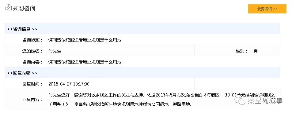 至于殡仪馆原址要建什么,之前在秦皇岛城乡规划局上,已经有人问过了,原址为公园用地、道路用地。