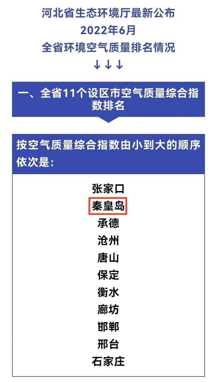 河北省生态环境厅较新公布了2022年1至6月和6月全省环境空气质量排名,一起来看秦皇岛的各项排名情况: