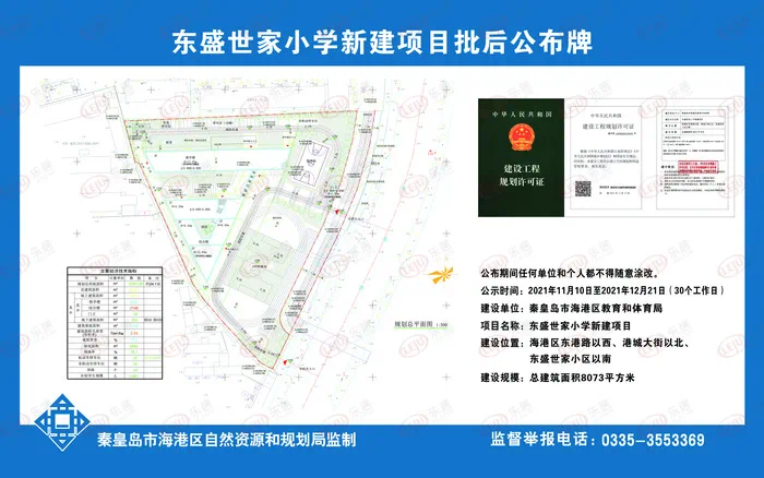 近日,海港区人民政府网站发布了东盛世家小学新建项目批后公布牌,项目位于海港区东港路以西、港城大街以北、东盛世家小区以南,总建筑面积8073㎡。规划24个班级,可同时容纳1080名在校学生就读。