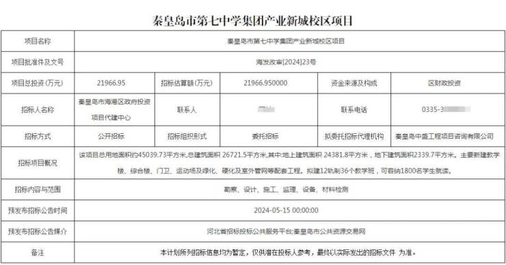 秦皇岛市第七中学集团产业新城校区项目已批准建设,现正对项目设计进行公开招标。