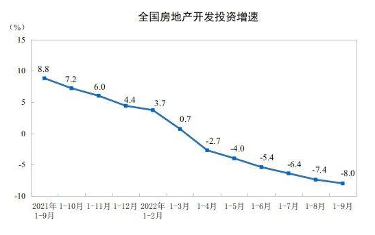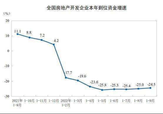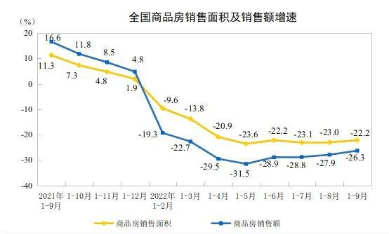 10月24日,国家统计局公布的《2022年1-9月份全国房地产开发投资和销售情况》显示,1-9月份全国房地产开发投资103559亿元,同比下降8.0%;商品房销售面积101422万平方米,同比下降22.2%;商品房销售额99380亿元,下降26.3%;房屋竣工面积跌幅连续2个月收窄,开发商资金面继续好转。