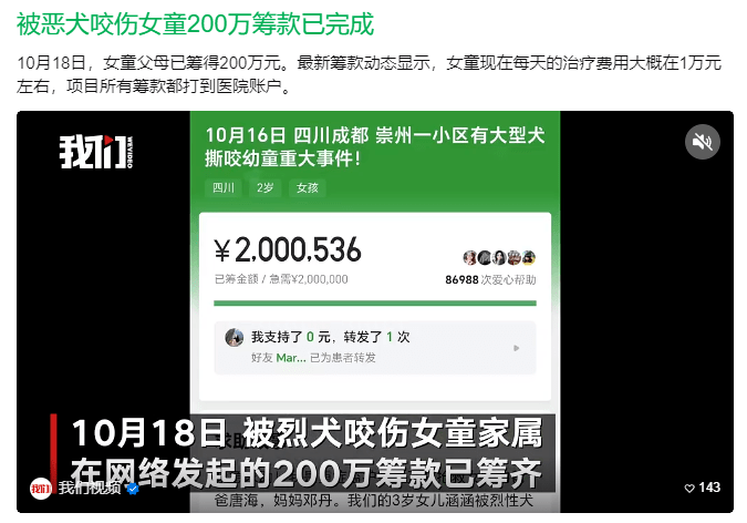 10月16日,成都崇州一小区2岁女童被烈犬扑倒撕咬,致受伤严重。事件持续引发关注,多个相关话题登上热搜。