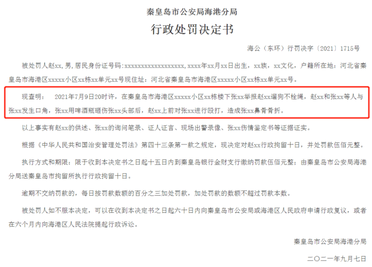 2021年7月9日,海港区一小区因张某某举报赵某某遛狗不栓绳,双方发生口角,大打出手。