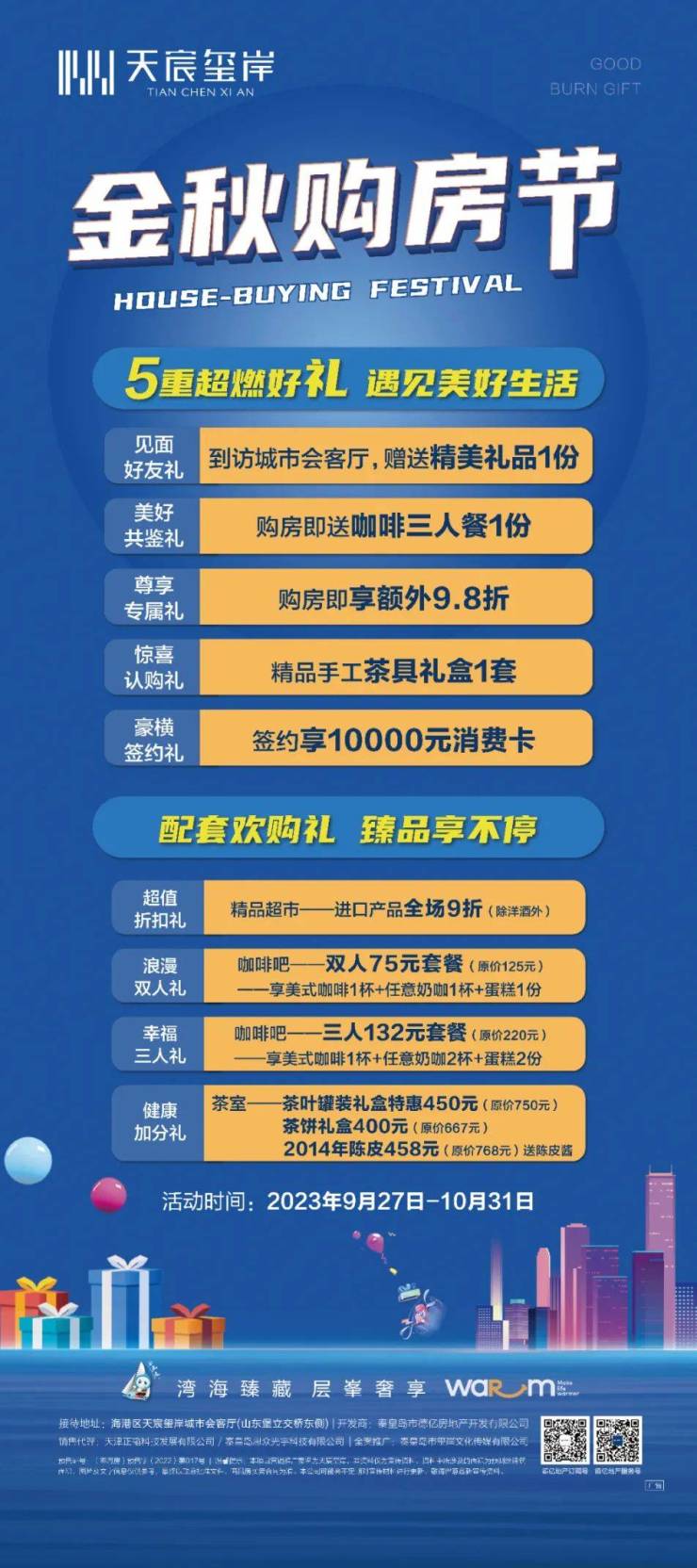 本次展会,天宸玺岸以300㎡特装展位惊艳亮相港城,为了感谢社会各界的持续关注和重视,天宸玺岸特别推出金秋购房节活动,购房享五重好礼!同时天宸玺岸城市会客厅内各配套重磅推出四重欢购礼,精致好物享不停!为美好生活加码,让美好触手可及!