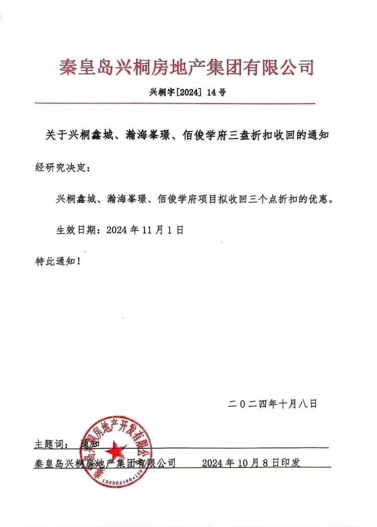 秦皇岛兴桐地产三盘折扣将于11月1日收回