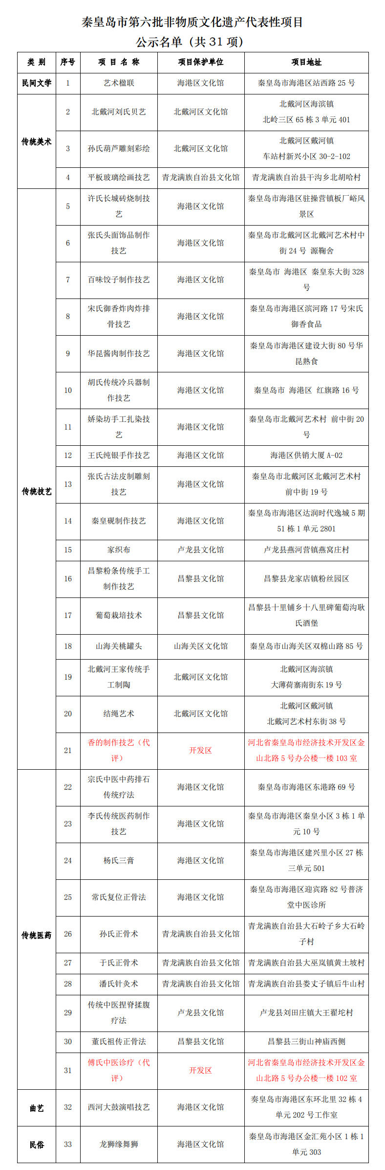 秦皇岛第六批非物质文化遗产代表性项目公示名单