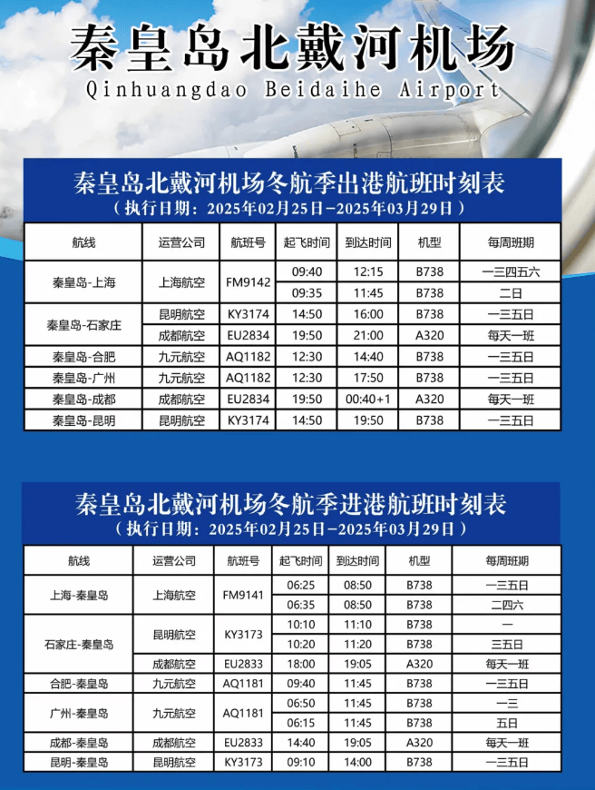 为进一步完善航线网络布局,满足旅客出行需求,秦皇岛北戴河机场计划自3月30日起开通至忻州五台山、西安航线。