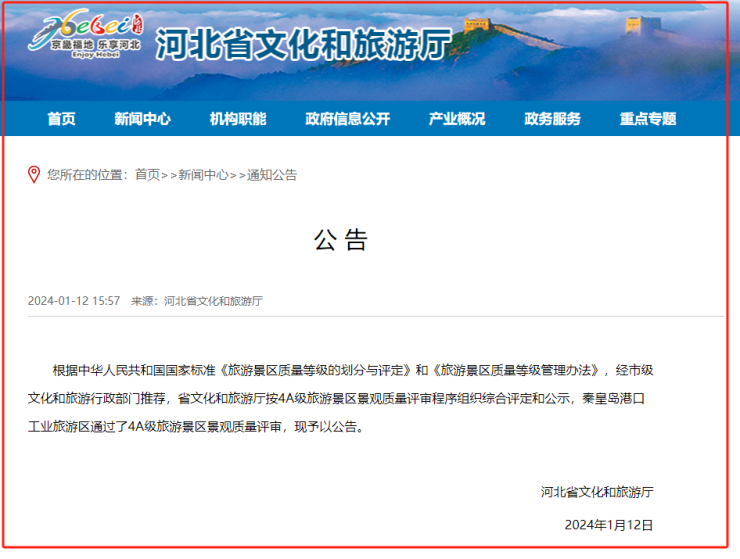 近日,河北省文化和旅游厅官网发布公告,秦皇岛港口工业旅游区通过AAAA级旅游景区景观质量评审。