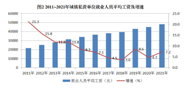 2021年,全省城镇私营单位就业人员平均工资48185元,比上年增加3243元,名义增长7.2%,增速比2020年提高2.5个百分点。扣除价格因素,2021年全省城镇私营单位就业人员平均工资实际增长6.2%。