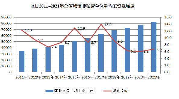 2021年,全省城镇非私营单位就业人员平均工资82526元,比上年增加5203元,名义增长6.7%,增速比2020年提高0.7个百分点。扣除价格因素,2021年全省城镇非私营单位就业人员平均工资实际增长5.7%。