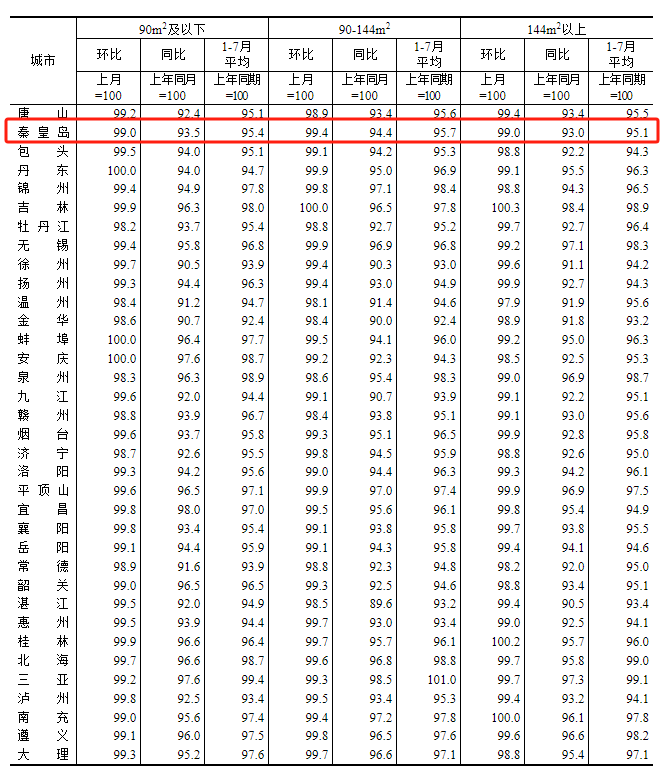 数据显示,7月份秦皇岛新建商品住宅价格环比下跌0.8%,同比下跌6.1%;二手住宅价格环比下跌0.9%,同比下跌9.1%。