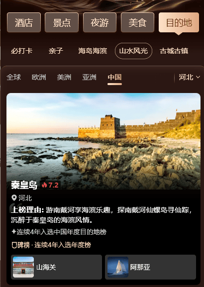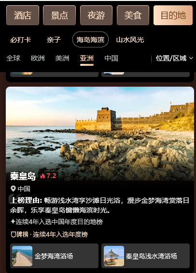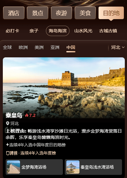 乐享滨海风光,秦皇岛同时入选“亚洲海滨海岛目的地榜”及“中国海滨海岛目的地榜”。