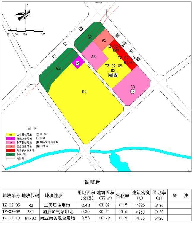 调整内容:二类居住用地面积缩减,由3.35公顷调整为2.46公顷;同时新增0.36公顷加油加气站用地和0.53公顷商业商务混合用地。