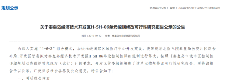 这次规划修改,主要是为了完善北医三院秦皇岛医院(北京大学第三医院秦皇岛分院)周边片区规划。