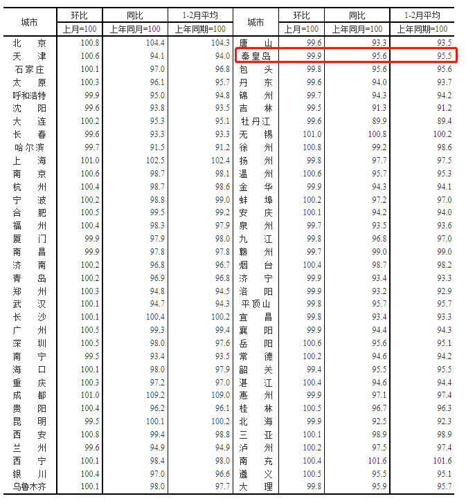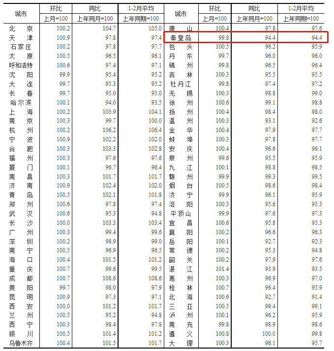 数据显示,2月份秦皇岛新建商品住宅价格环比下跌0.2%,同比下跌5.6%;二手住宅价格环比下跌0.1%,同比下跌4.4%。