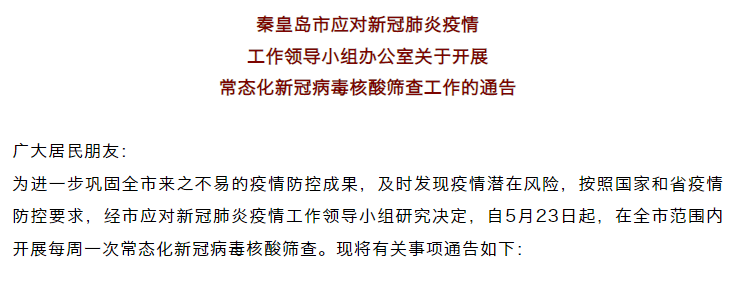 日前,秦皇岛市应对新冠肺炎疫情工作领导小组办公室关于开展常态化新冠病毒核酸筛查工作的通告那么,我们该去哪里进行核酸采样呢?昨天晚上,较新消息来了,秦皇岛卫生健康委员会发布常态化核酸采样点设置情况表▼来源:秦皇…