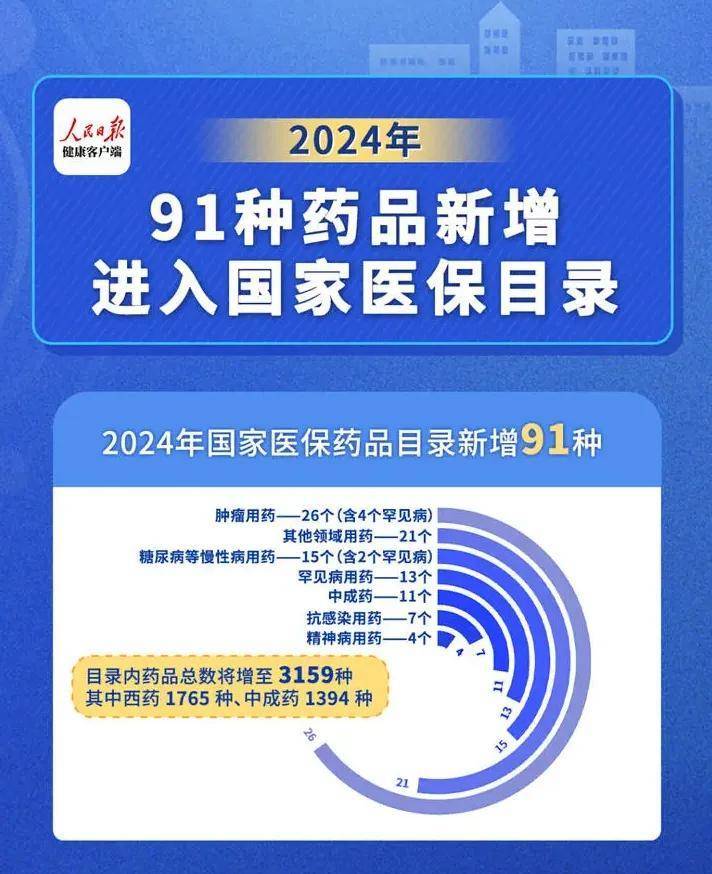 新增91种药品中,主要包括26种肿瘤用药(含4种罕见病)、15种糖尿病等慢性病用药(含2种罕见病)、13种罕见病用药、7种抗感染用药、11种中成药,以及精神类、其他领域用药。本次调整后,目录内药品总数将增至3159种,其中西药1765种、中成药1394种,中药饮片部分892种。肿瘤、慢性病、罕见病、儿童用药等领域的保障水平得到明显提升。