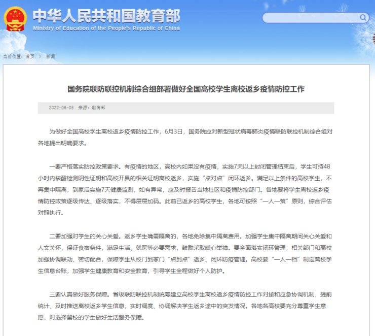 为做好全国高校学生离校返乡疫情防控工作,国务院应对新型冠状病毒肺炎疫情联防联控机制综合组日前对各地提出明确要求。