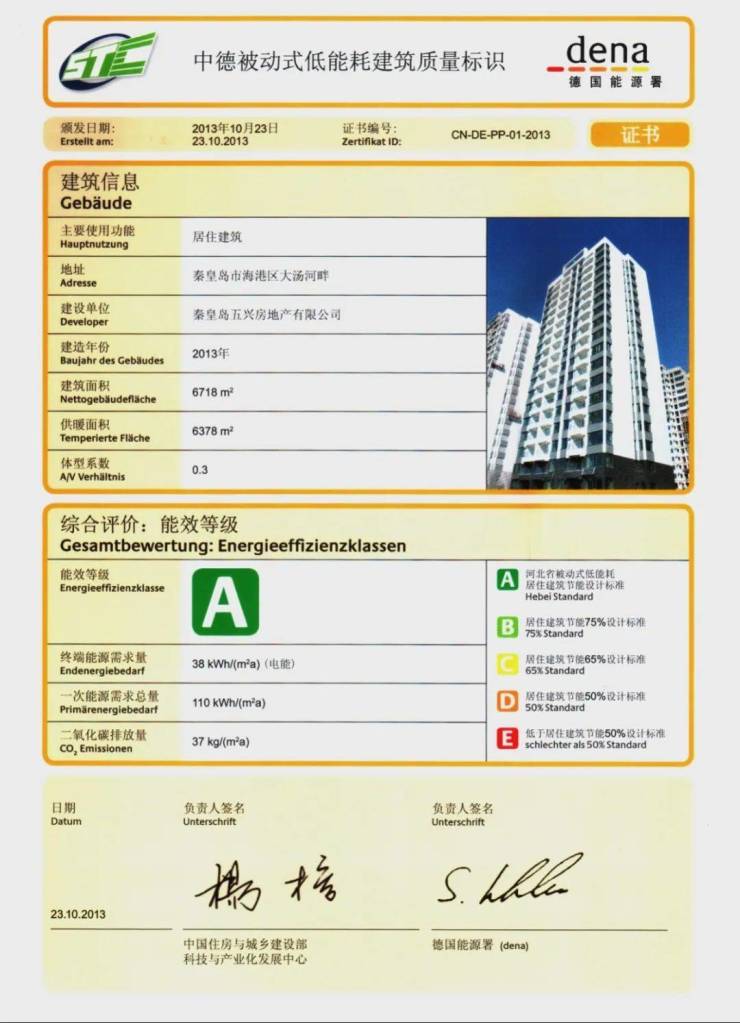 秦皇岛“在水一方”被动房示范项目,是中国第一个被动式超低能耗绿色住宅建筑,中国首例“中德合作”被动式超低能耗建筑示范工程。示范项目顺利通过了德国能源署最终验收,并颁发了质量认证标识,该示范项目的节能率高达92%。