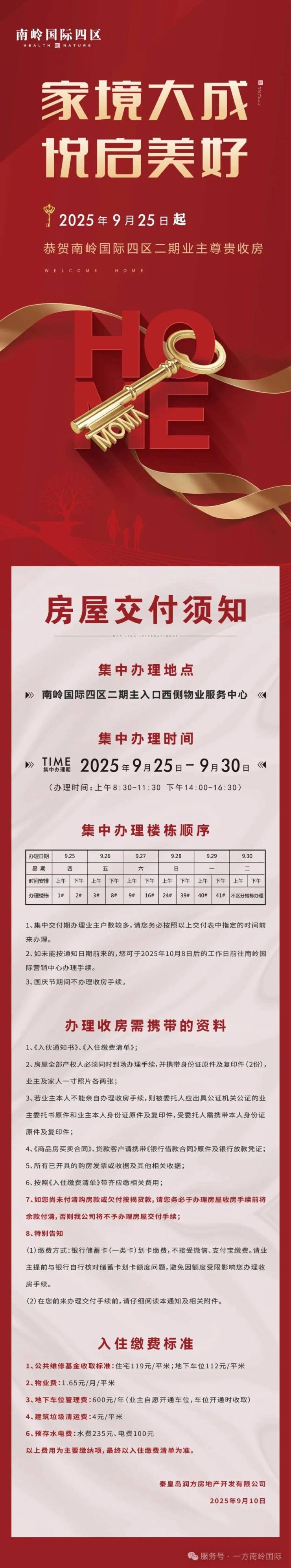 不负期待,盛大交房!南岭国际四区二期将于2025年9月25日起盛大交付,请各位业主仔细阅读以下通知,准时前来办理收房。