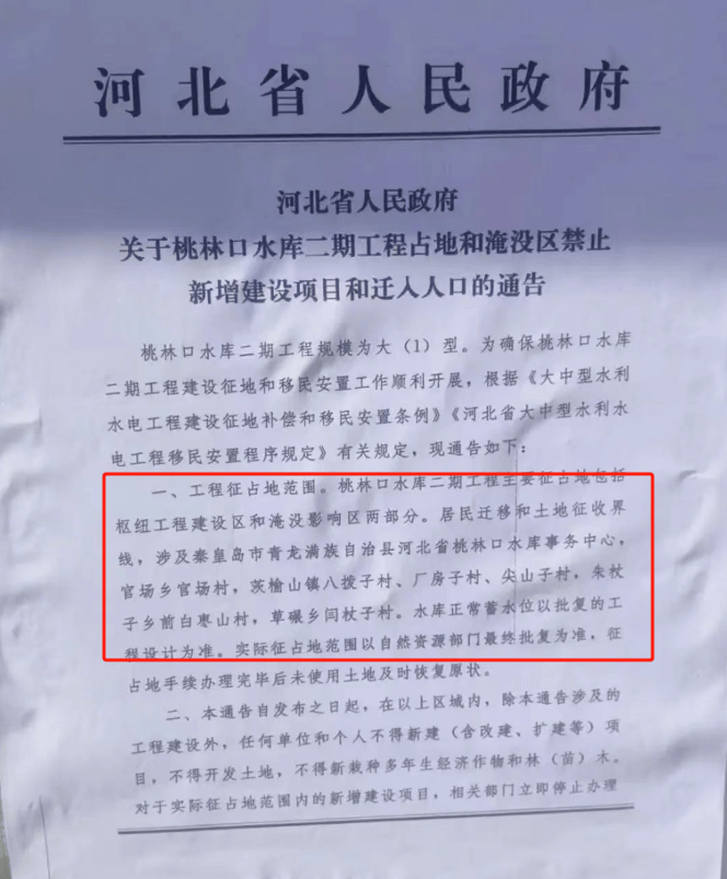 近日,河北省人民政府办公厅发布关于桃林口水库二期工程占地和淹没区禁止新增建设项目和迁入人口的通告。