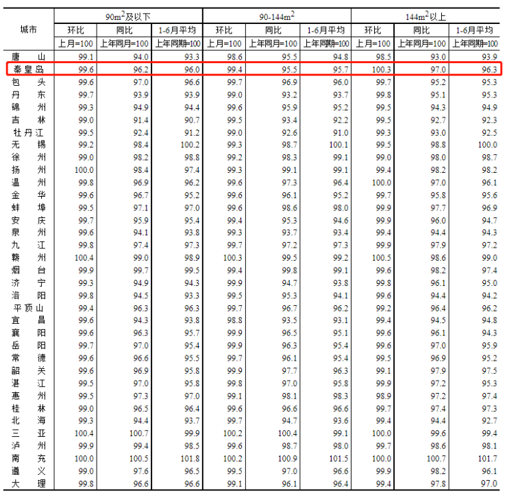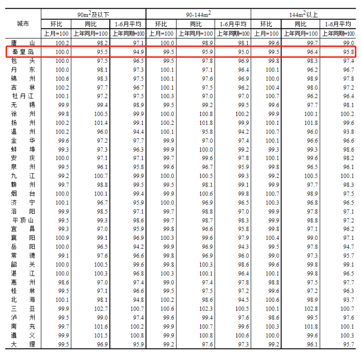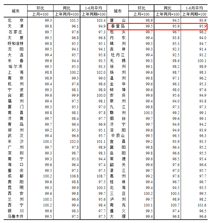 数据显示,6月份秦皇岛新建商品住宅价格环比下跌0.4%,同比下跌4.1%;二手住宅价格环比下跌0.5%,同比下跌4.1%。