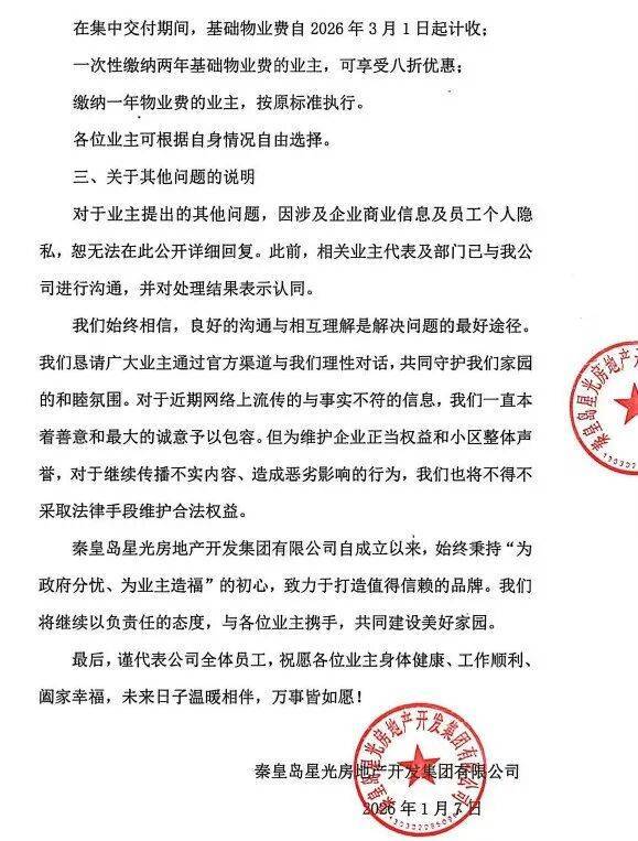 开发商在致函中同步推出物业费优惠,可被视为对业主初期体验反馈的一种积极回应。以此来表达诚意和对业主意见的重视。